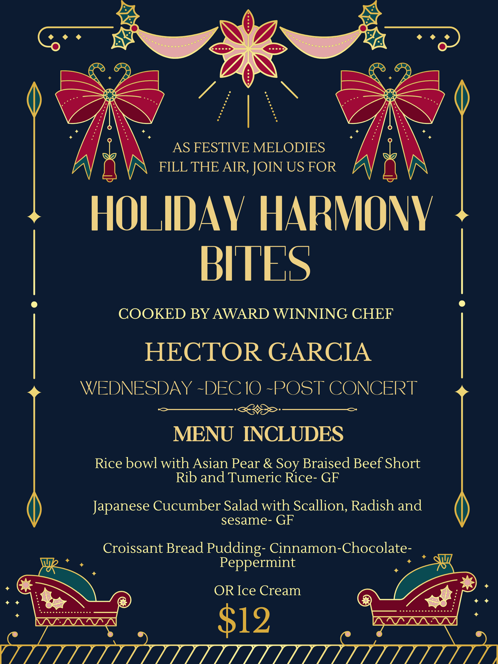 Pro Chef Hector Garcia spent over a decade in fine dining before going into business for himself. Hectors love of music and experience as a double bassist have led to the collaboration you'll be tasting after the concert! Pre Sale tickets are $12.